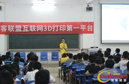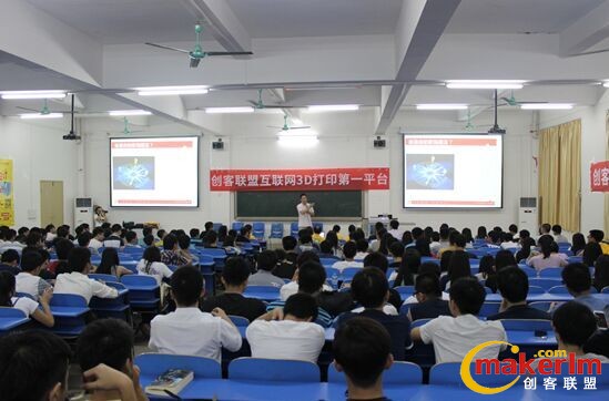 5月19日創客聯盟與廣東科技學院的同學分享  3D打印技術,四位大牛人物暢享奮斗人生。創客聯盟創始人陳晶、技術總監黃明光,同時創客聯盟邀請一覽英才網運營總監薛泉源、  東莞集思工業設計有限公司首席設計師鄧少峰共同向同學分享自己的職場價值觀與設計理念。