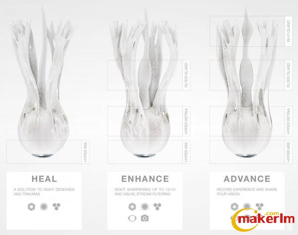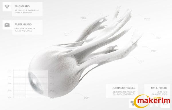 意大利MHOX設計工作室的首席設計師Filippo Nassetti說:“在生物打印和生物黑客技術方面的進展,讓我們得以展望在不遠的將來,人類也許能輕易地打印器官和實用性的身體部位,讓人類能替換下身體有缺陷的器官或提高身體機能。”這一未來主義概念被稱作眼部功能增強(EYE)。